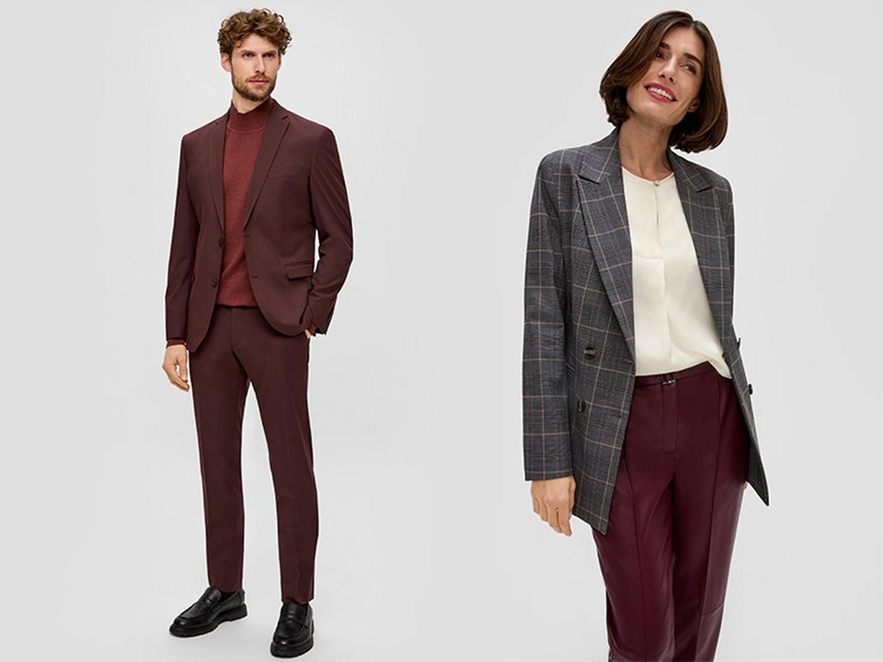 Schwarz: Schwarz passt ebenfalls sehr gut zu dunkelroten Farbnuancen. Ideal für einen Look fürs Office: eine schwarze Palazzohose, eine bordeauxrote Bluse und ein schwarzer Blazer dazu. Fertig ist der Go-to-Look fürs Büro.
